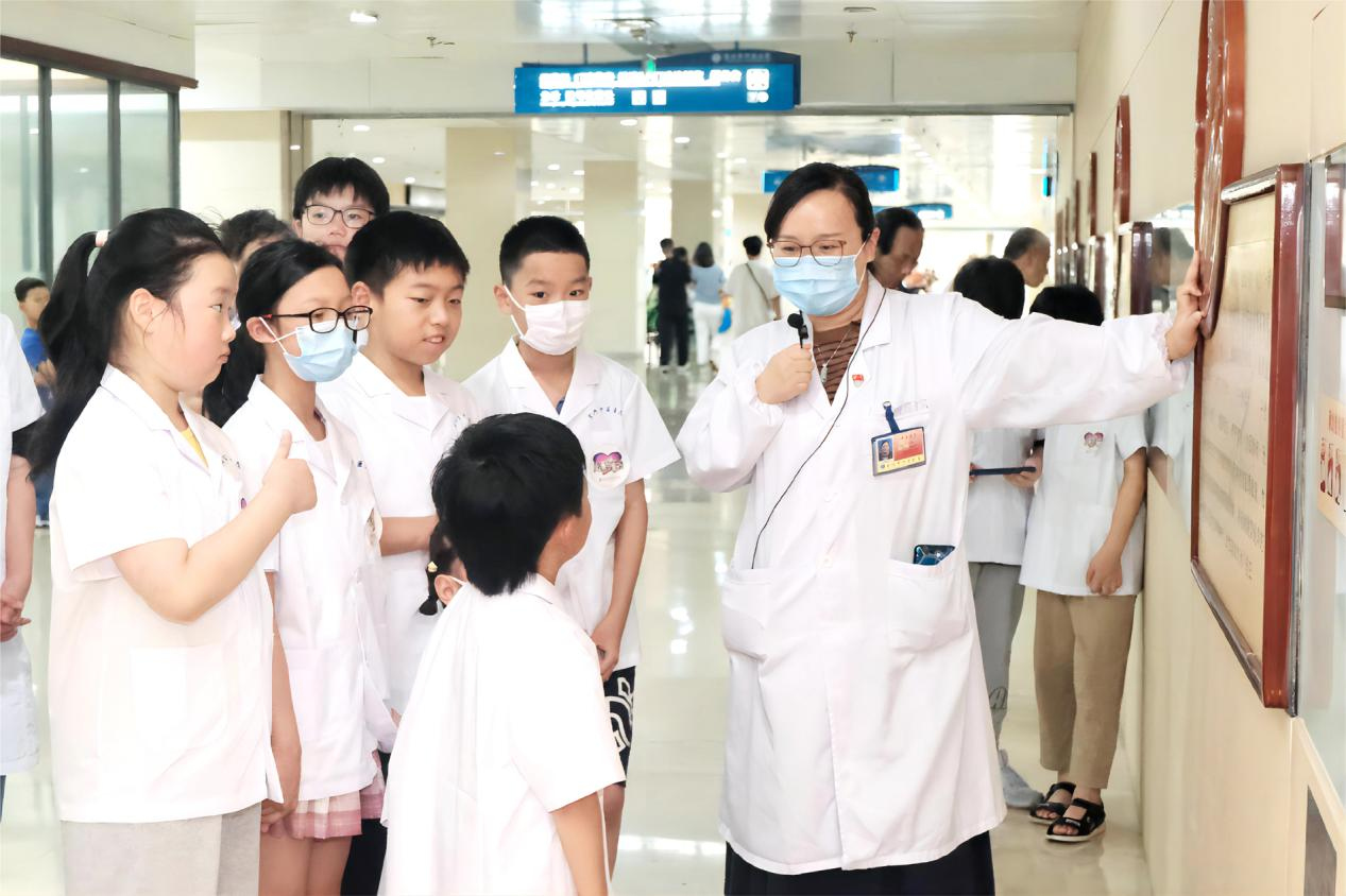 “阳羡杏林小郎中”夏令营活动的第一站是位于我院门诊一楼的中医文化长廊。医务人员带领孩子们观摩了墙壁上的古代名医木刻雕像,并用风趣幽默的语言,为他们讲述华佗、扁鹊、孙思邈等名中医的典故轶事,让孩子们在有趣的故事中了解中医药发展的历史,领悟“医乃仁术”“大医精诚”等中医药文化核心价值理念。