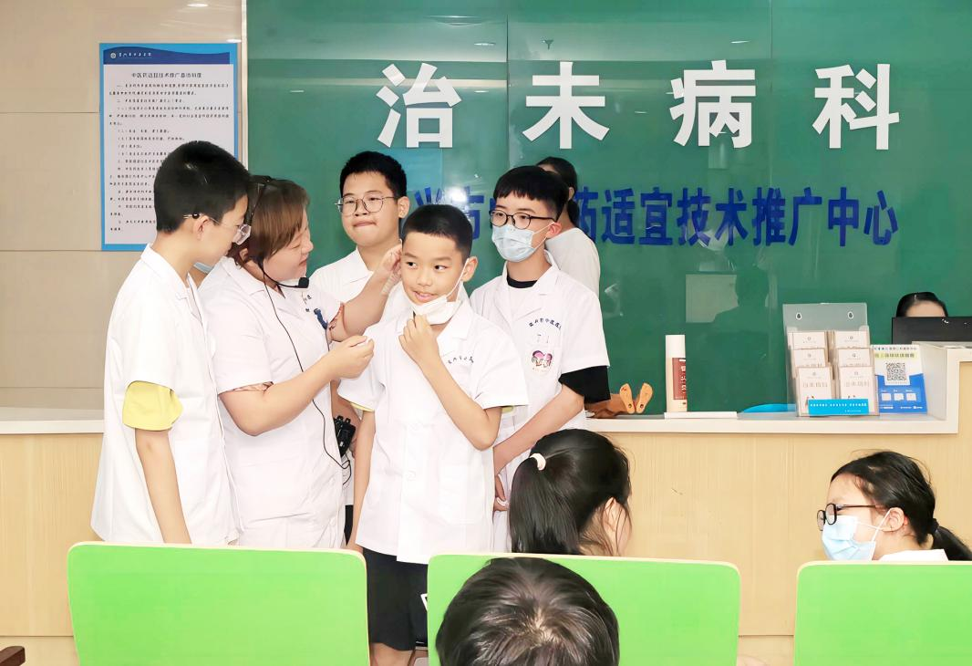 在门诊三楼治未病科,医务人员为大家介绍了治未病的含义、人体经络、穴位,以及艾灸、刮痧、拔罐等中医适宜技术的功效。孩子们在台下听得津津有味,争相传看艾条、耳穴模型等物品,到了现场操作环节,更是兴奋不已,踊跃举手报名,亲身体验耳穴埋籽、穴位按摩等中医操作。